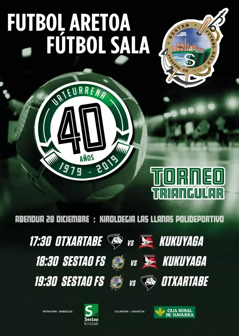 El próximo Sábado día 28, celebraremos los actos centrales de nuestro 40 aniversario. El evento, que se celebrará en Las Llanas, constará de un Torneo Triangular en los que participarán el Otxartabe, Kukuyaga y Sestao. El torneo dará comienzo a las 17:30 horas con el enfrentamiento entre Otxartabe y Kukuyaga. A las 18:30 horas se enfrentarán Kukuyaga y Sestao FS y a las 19:30 horas lo harán Otxartabe y Sestao FS.
